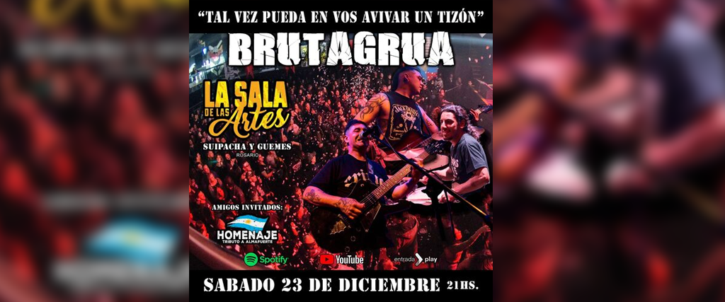 Brutagrua arriba este sábado a La Sala de las Artes. Se trata de “una expresión musical pesada que busca apuntar directo al centro del sentimiento inevitable”, según la reseña que invita al espectáculo. Grupo invitado: Homenaje (tributo a Almafuerte). Click para acceder a la venta de entradas.