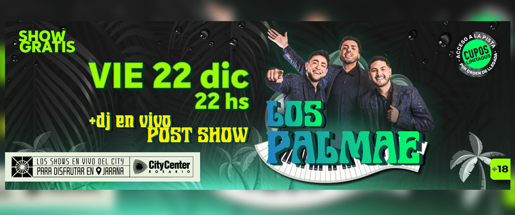 Palmae, el grupo de cumbia santafesina producido por Los Palmeras, vuelve al escenario del City para ir calentando la previa de Nochebuena. “Covers, temas propios y diversión extrema te esperan en la noche del viernes”, indicaron en la invitación. Click para acceder a las entradas.